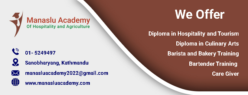 Manaslu Academy of hospitality and Agriculture, located in sanobharyang, Kathmandu is one of the competitive hotel management schools, This institute was established with a clear vision of preparing skilled manpower to meet the growing needs of hospitality professionals. It provides world-class diploma and short –training courses with professional standards. Manaslu is a government recognized school and affiliated to council for Technical Education and Vocational Training (CTEVT) and associated with Metropolitan College Singapore, BPXI China, and Mandala Boutique Hotel, Chhetrapati, Kathmandu.